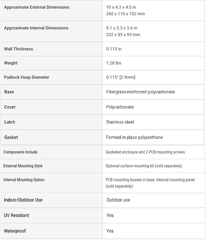 Основная базовая имеет 16 удобных монтажных боссов, что позволяет легко и безопасно установить вашу печатную плату или другие устройства. Будь то в помещении или на открытом воздухе, этот блокируемый корпус обеспечивает надежную защиту для ваших критических электрических и электронных компонентов.