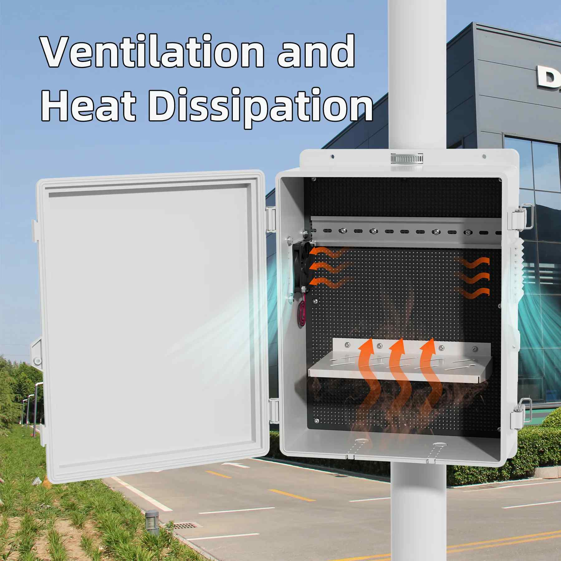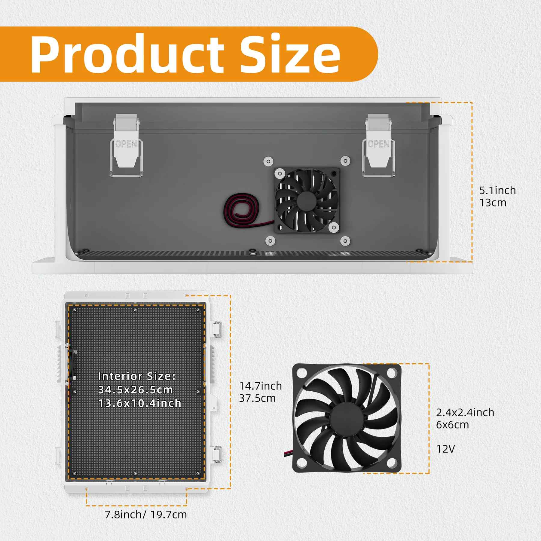 【Высшая вентиляция для оптимальной производительности】- Эта коробка электрического корпуса оснащена встроенным вентилятором 12V и вентилируемыми боковыми панелями, чтобы способствовать циркуляции воздуха и рассеянности тепла, как показано на изображениях с открытым корпусом и стрелками воздушного потока. Интегрированная система вентиляции помогает предотвратить перегрев чувствительных электронных компонентов внутри коробки.