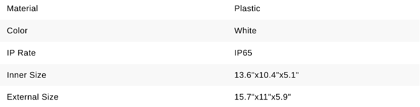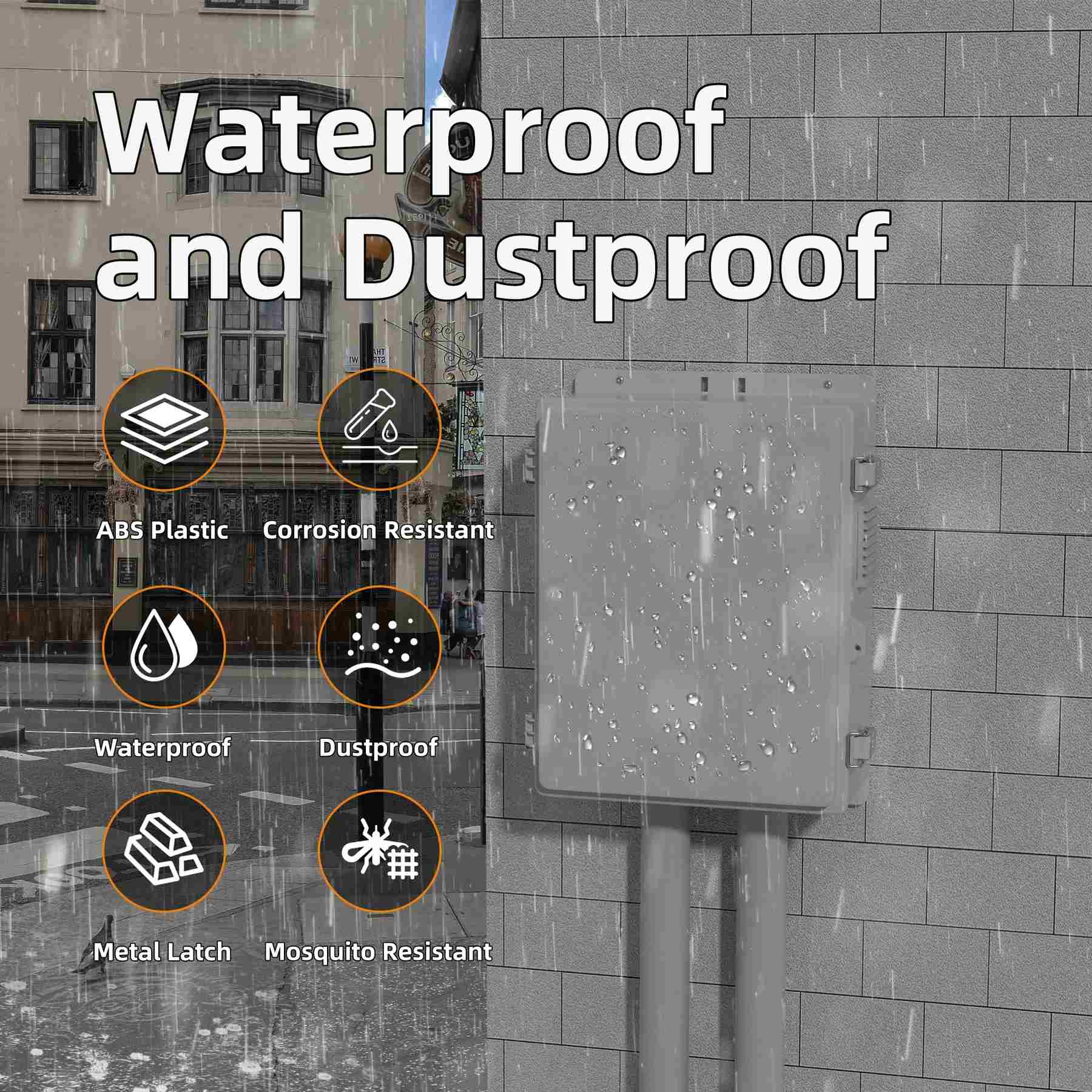 【Прочная, погода и безопасная конструкция】- коробка изготовлена из тяжелого пластика ABS, что делает его коррозионным устойчивым и устойчивым к повреждению ультрафиолета, о чем свидетельствует иконки, которые показывают, что он является водонепроницаемым, устойчивым к коррозии, устойчива к комам и имеет металлическую защелку для дальнейшего уплотнения. Корпус также является водонепроницаемым и пыленным IP65 и имеет безопасные металлические защелки.