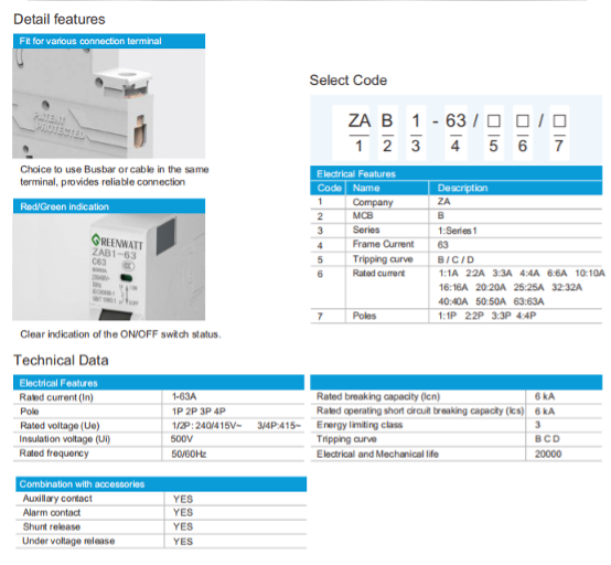 Модель: ZAB1-63Brand: Greenwatttype: миниатюрный выключатель цепи (MCB) Полюса: 4 (четырехполь). Оценка. Текущий Надежность и долгое обслуживание LifeEasy Din Rail InstallationCompact Design для экономии пространства в распределительных досках